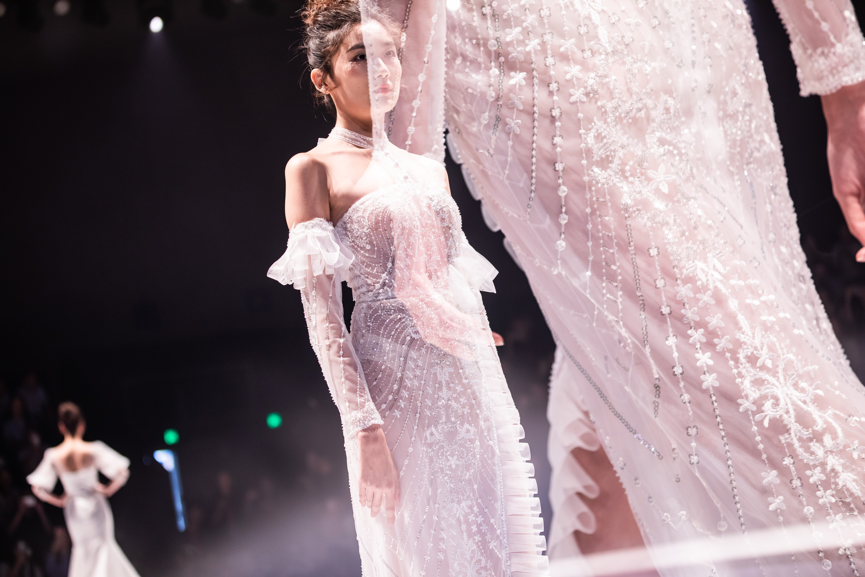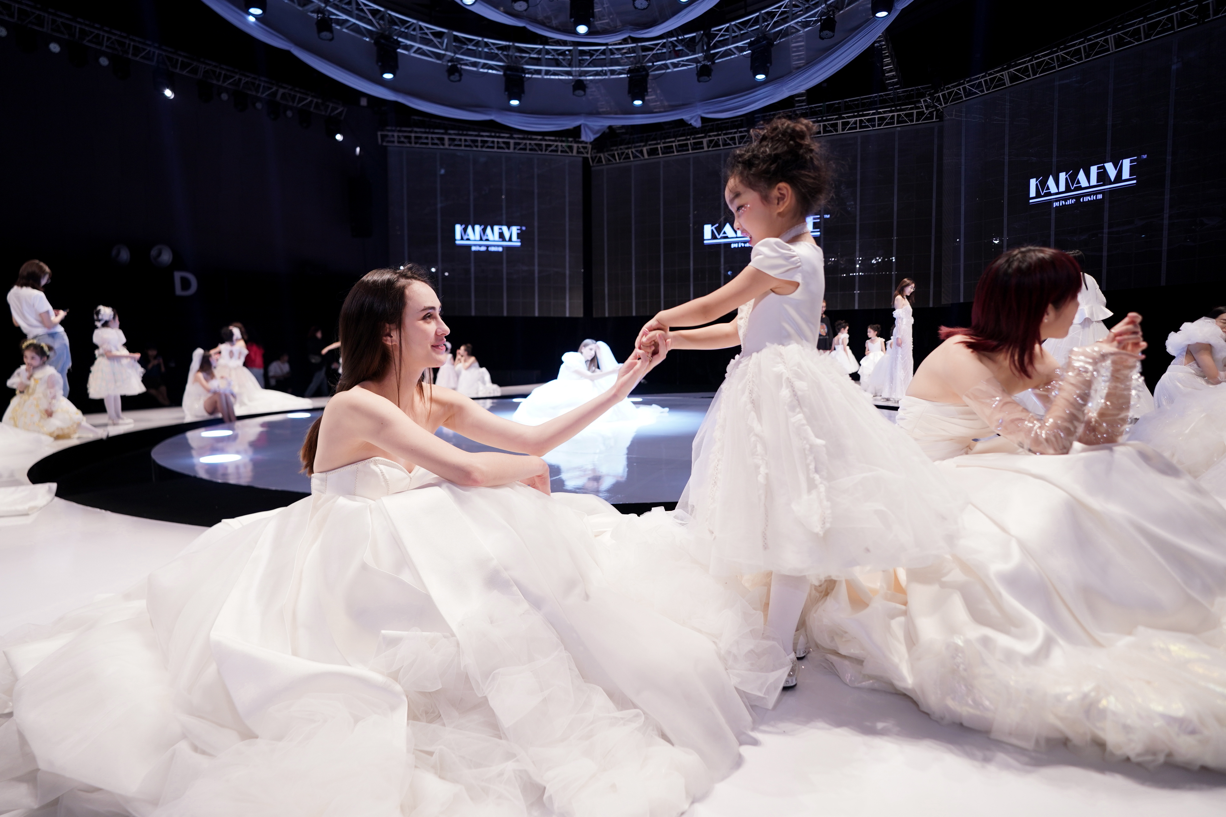 大秀启幕,伴随着音乐盒的音乐响起,芭蕾小舞者翩翩起舞,欢快的音乐,台上台下的完美互动,俨然是一个欢乐的法式派对现场,洛丽塔、高定礼服轮番经由大小模特完美展示、惊艳登场,最后由芭蕾舞小舞者带着设计师出场谢幕,现场掌声不断,气氛热烈!